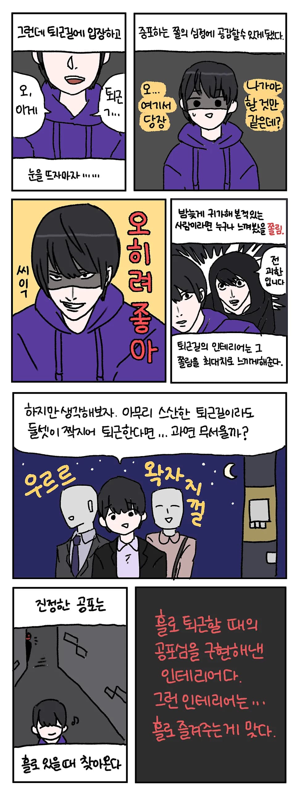 안녕하세요! 주로 블로그에 방탈출 후기를 올리다가 좋은 기회로 이곳에도 후기를 올리게 된 월하독작입니다. 다음은 제가 100방 기념방으로 플레이한 테마인 퇴근길의 만화 후기입니다.... 더보기