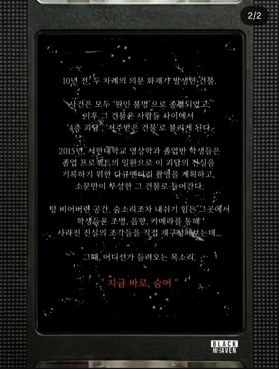 제일기숙학원 2인>버디 2인>학교 5인>슬래셔 3인>층간소음 2인>나폴리탄 2인>피그 3인>콜러 2인>4F마지막기록 4인>생존자 2인>한강대담력훈련 6인>메트로 2인>하피스캔디샵 3인>퇴근길 2인>잭인더쇼 3인