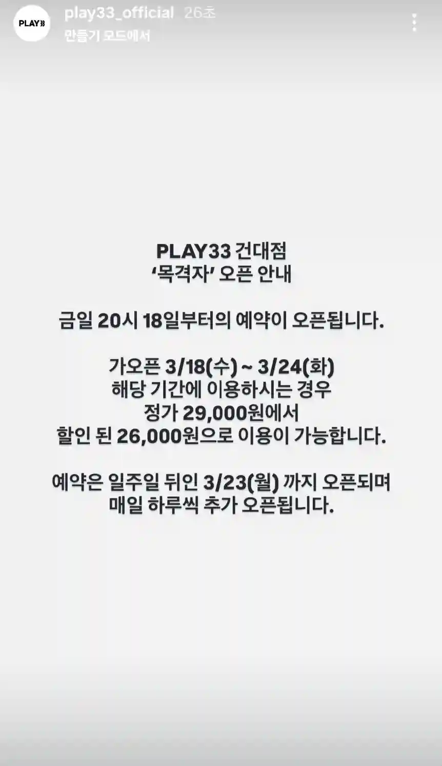 플레이33 건대점 목격자 예약오픈 16일 20시 오픈