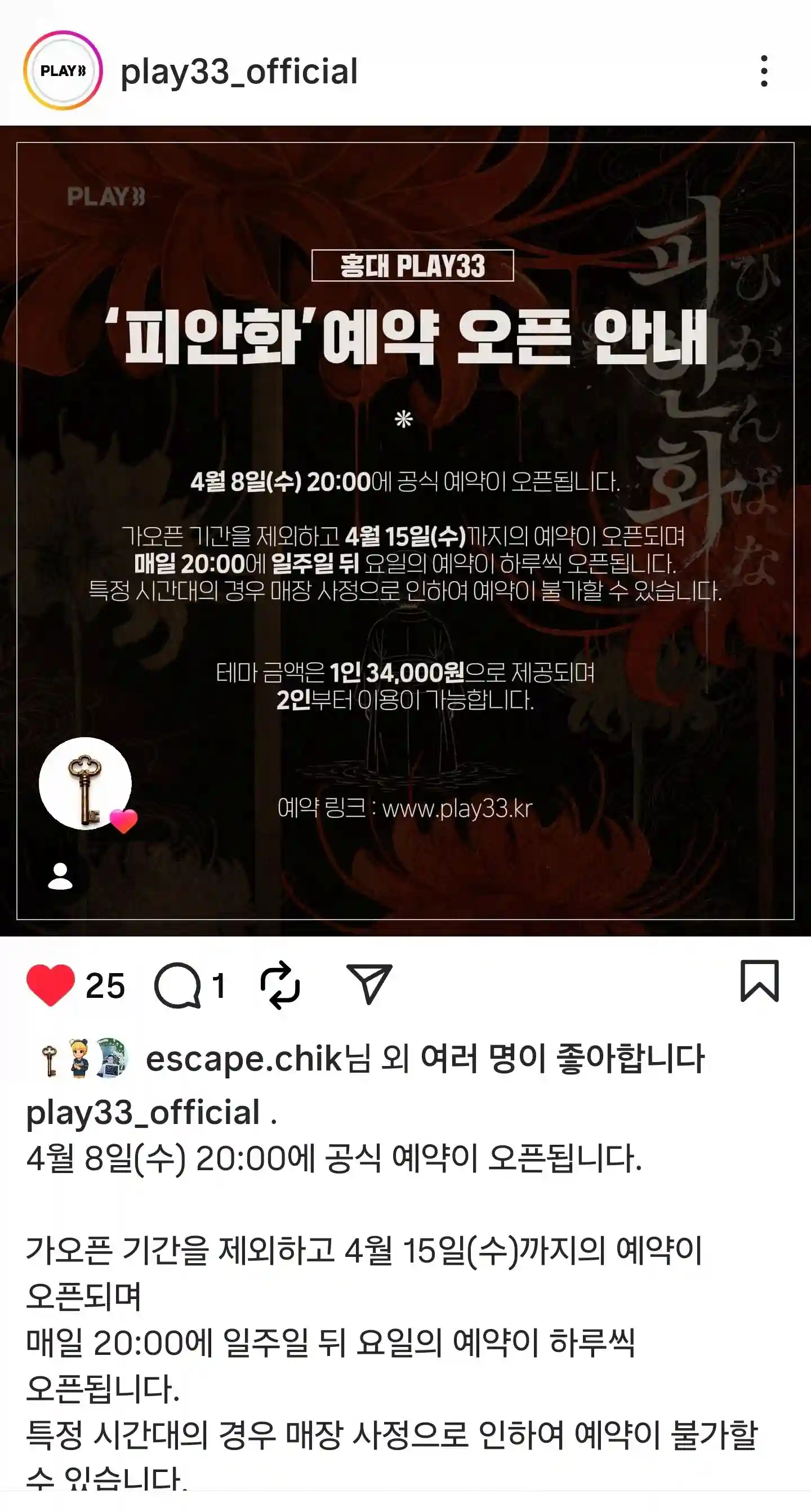 플레이33 홍대 피안화 예약오픈 안내+1N