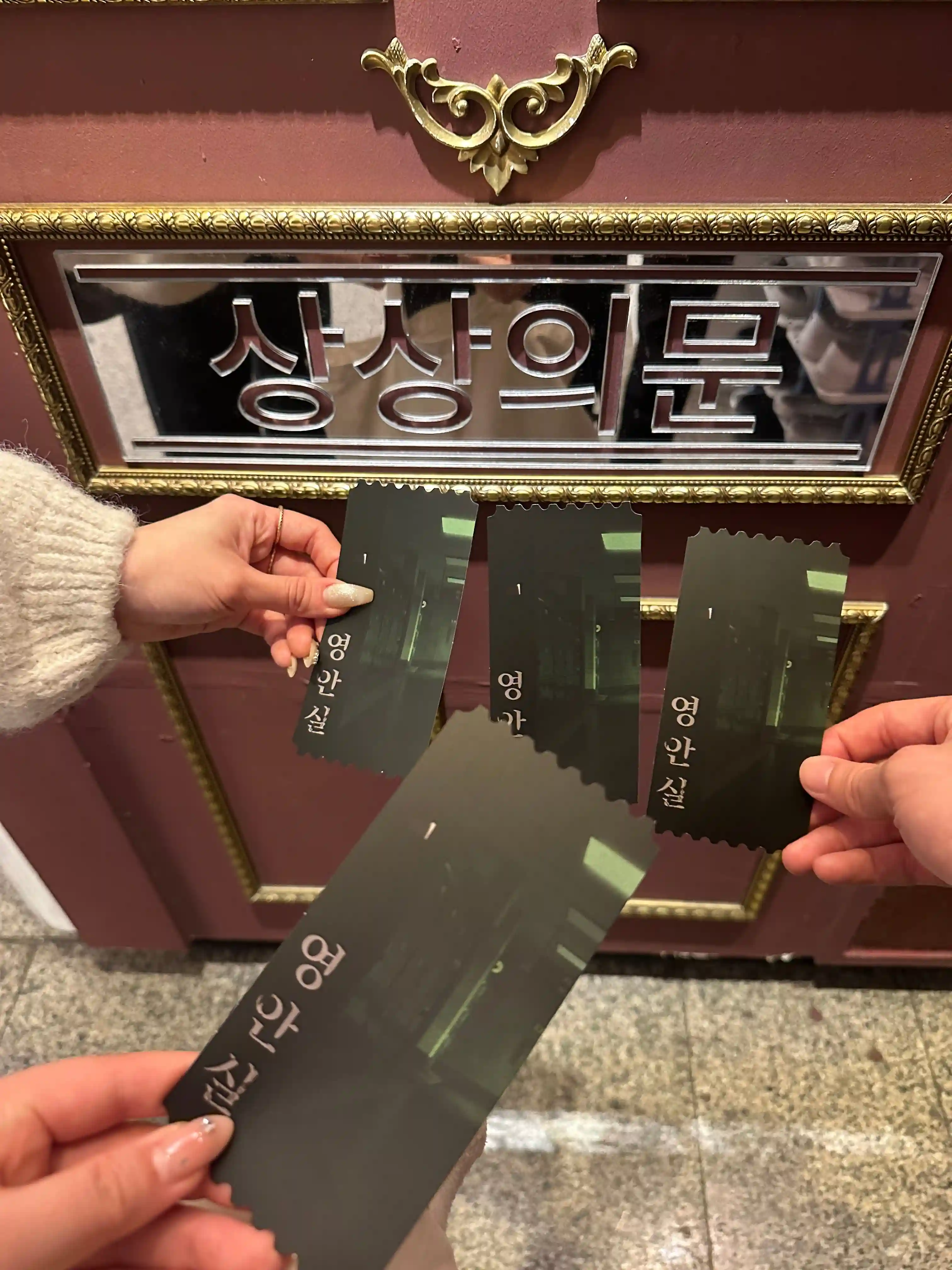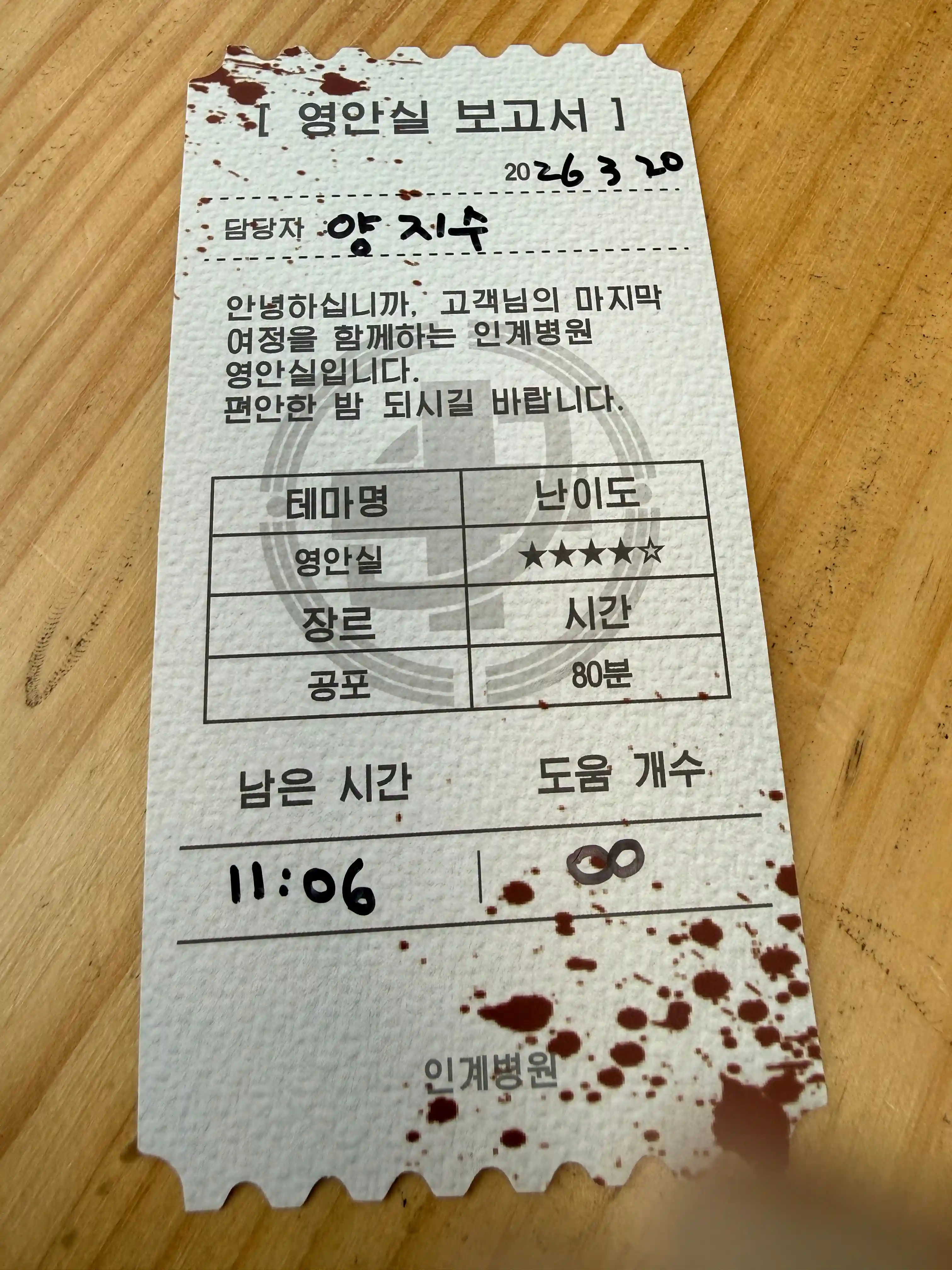 입장할때 영안실 이란 제목과 관련이 없어보이는 무언갈 주셨어요 이거슨 스토리 설명 들을때 알게됩니당ㅎㅎ들어가자마자 첫 문제부터 난관이었는데 일행 모두 힌트에 거부감이 없어서 힌트 써가면서 했어요!근데 제가 관찰력없음이슈에도 불구하고 이번 테마에선 관찰력 매우 좋았어요!저의 활약?이 꽤 있었죠? ㅎ